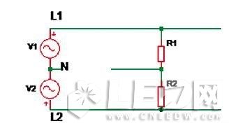 如圖3所示,V1表示第一相電壓,V2表示第二相電壓,R1及R2分別表示正常安裝到線路中的LED驅動器。當線路上零線(N)如圖斷開時,兩個支路上的驅動器R1,R2相當于串聯后接到380Vac電壓上。因為輸入內阻差異,當其中一個驅動器充電到啟動時,內阻變小,電壓可能大部分加到另外一個驅動器上,導致其過壓損壞失效。因此建議同一配電支路上,開關或斷路器要一起斷,不能只斷開零線。配電保險絲不要放在零線上,線路上要避免零線接觸不良。