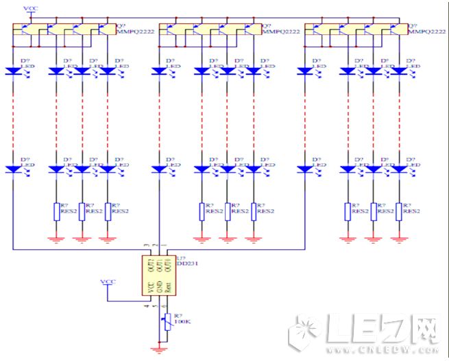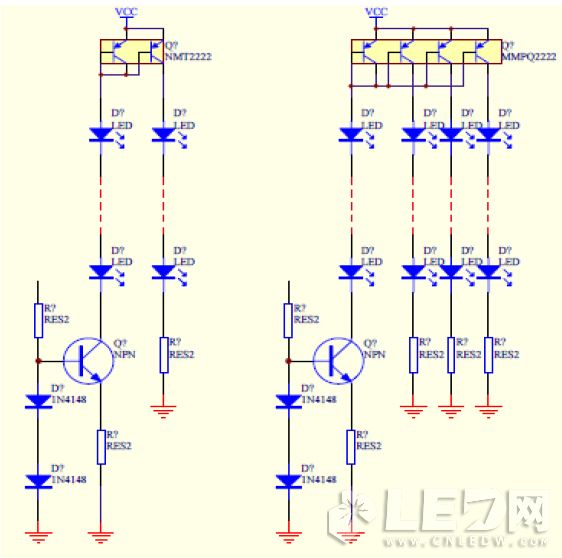 下圖采用集成三極管可以保持每路LED電流一致,這些三極管在相同溫度環境下、相同工藝條件生產出來的β值一樣,可以保證每路電流基本一樣。恒流部分在要求不是很高的條件下可以這樣設計,穩定的電壓或穩定的PWM伏值驅動穩壓后的三極管偏壓,做到基本恒流。