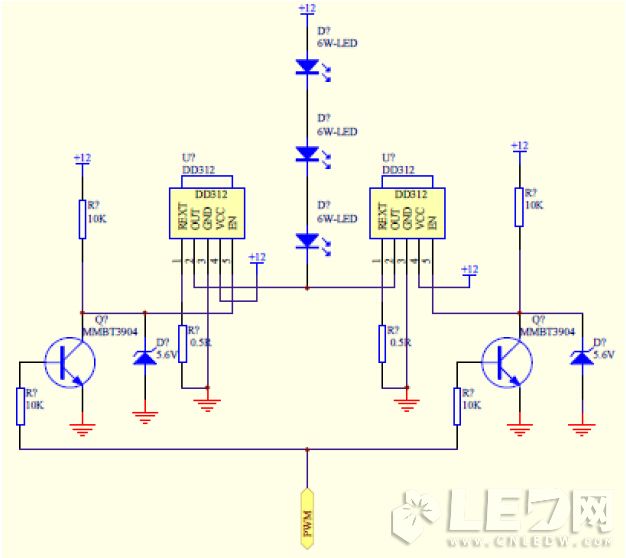 下圖采用DD312并聯參考設計直接驅動3顆6W LED。使能PWM控制信號需要適當的隔離,避免相互干擾和驅動能力問題。EN使能電壓要符合規格書要求,不要電壓太高損壞EN腳。一般IC耐壓是指負載和電源,沒有注明激勵電壓請不要大于5V設計。