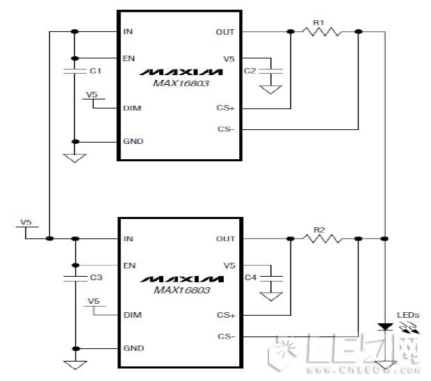 像這種檢測在LED的一端LED恒流驅動IC也可以并聯設計驅動,實際上IC是單獨工作的,最后在并流一起。DC-DC方式是工作在較高的頻率上,需要注意的是PCB布板時避免交叉設計,各自濾波、旁路電容要緊靠IC附近,負載電流最后會和即可。