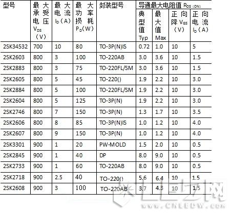根據下面功率MOSFET表3.7,可以選擇2SK2718型號。它的最高承受電壓為900V,允許最大電流為2.5A,而功率損耗是40W,是上面功率最小損耗的。