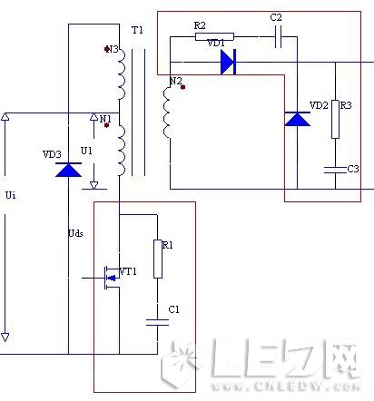 在開關電源中,由于變壓器的漏感、布線的引線電感存在、開關管在關斷瞬間會產生很高的電壓尖峰脈沖。整流快速恢復二極管由于存在存儲效應,反向恢復過程中也會出現很高的反向恢復的碾壓尖峰脈沖。這些過電壓尖峰脈沖的出現不但危及功率器件的工作安全性,而且形成很強的電磁干擾噪聲。為此必須在功率器件兩端設計尖峰電壓緩沖吸收電路。緩沖電路圖如圖中紅框部分: