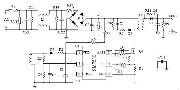 SM7530采用專利的恒流控制技術,輸入無需電解電容。適用于85Vac~265Vac全范圍輸入電壓,恒流精度可達到±5%,PF值大于0.9,具有輸出開、短路保護特性。典型方案原理圖如下: