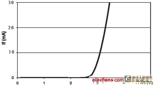LED的伏安特性和普通的二極管相似。用于白光照明的藍光LED典型的伏安特性如圖1所示。
