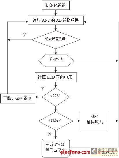 PIC12F675初始設置GP4輸出高電平,如測得LED正向電壓在合理范圍內,則維持高電平輸出使LM3404正常工作;如LED正向電壓逐漸變低并低于設定值18.68V,則在GP4引腳輸出PWM信號,其占空比可依次降低,直至LED正向電壓低于設定值。當測得LED正向電壓很高時可判定輸出開路, PIC12F675可輸出低電平關閉LM3404的輸出。