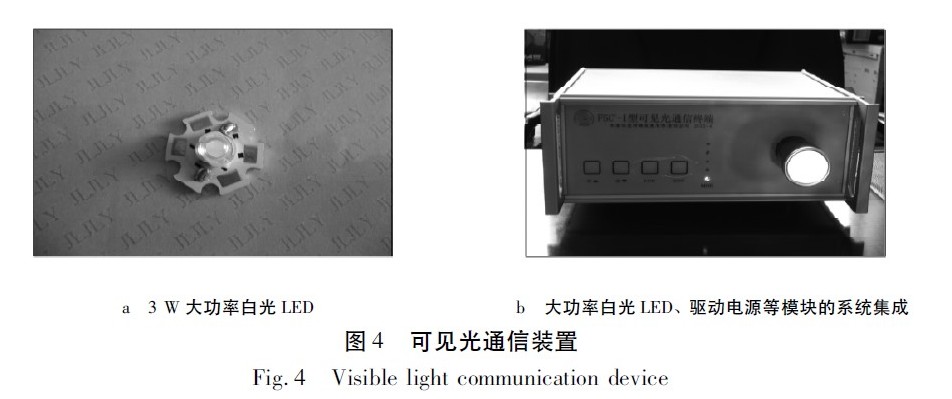 為測試所制作的雙DC /DC 并聯供電系統的性能,采用3 W 大功率白光LED( 額定電流750 mA、額定電壓4. 0 V) 做了驅動實驗與性能測試,LED 的照片如圖4 所示。將大功率白光并聯供電系統、大功率白光LED、數據編碼模塊、Bias-Tee 耦合模塊以及按鍵/指示燈等進行了系統集成,研制了兼具照明與通信雙重功能的通信裝置( 見圖4b) .利用該裝置,對給出的并聯供電系統進行了實驗。