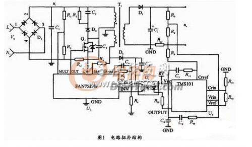 圖1為電路簡圖。電路采取單級反激式拓撲,由全波整流,DC/DC變換,輸出整流濾波電路,誤差反饋電路,PWM控制器電路構成。