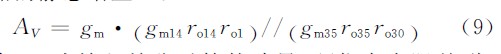 其中,gm為輸入差分對管的跨導,//代表電阻并聯,gm14和gm35分別為晶體管MN14和MP35的跨導,ro1,ro14,ro35,ro30分別為差分輸入對管和MN14,MP35,MP30的輸出電阻。