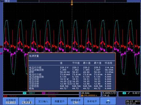 測量驅動電源的輸入功率、功率因數和諧波有很多方法,使用具有電源分析功能的示波器產品可以輕松實現這些電能質量測量。使用一路通道測量輸入電壓、一路通道測量輸入電流,配合示波器內置的PWR電源分析軟件,所有的電能質量相關參數可以直接顯示在屏幕中。