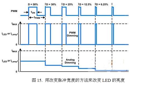 LED是一個二極管,它可以實現快速開關。它的開關速度可以高達微秒以上。是任何發光器件所無法比擬的。因此,只要把電源改成開關恒流源,用改變脈沖寬度的方法,就可以改變其亮度。這種方法稱為脈寬調制(PWM)調光法。圖15表示這種脈寬調制的波形。假如脈沖的周期為tpwm,脈沖寬度為ton,那么其工作比D(或稱為孔度比)就是ton/tpwm。改變恒流源脈沖的工作比就可以改變LED的亮度。