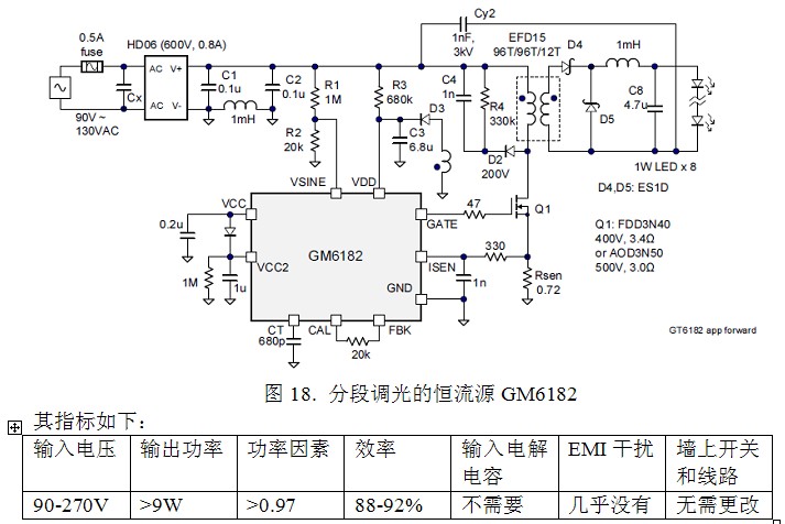 為了利用現有的墻上開關和墻內的兩根線,臺灣有一家公司推出了一種稱之為EZ-Dimming的GM6182的四段開關調光不失為一種好方案。它只利用墻上的普通電燈開關就能實現4段調光,第一次開為全亮,第二次快速開關為60%亮度,第三次快速開關為40%亮度,第四次快速開關為20%亮度。這種系統的優點是可以利用普通的墻上開關實現調光。而且其功率因素高達0.92以上。沒有產生干擾信號之慮。缺點是無法連續調光。還有操作麻煩一些。它實際上可以和恒流源設計在一起(圖18)。