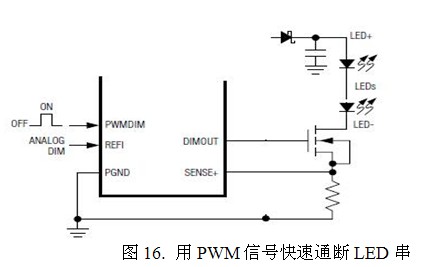 具體實現PWM調光的方法就是在LED的負載中串入一個MOS開關管(圖16),這串LED的陽極用一個恒流源供電。